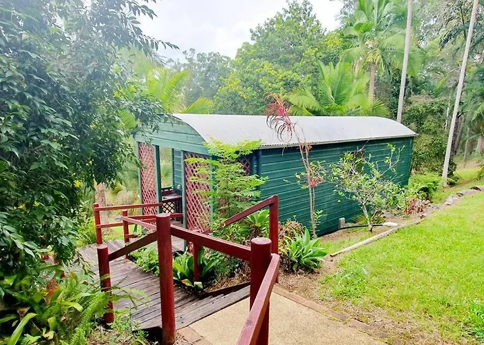 A kertre néző terasszal rendelkező 1 hálószobás Birdsong Train Carriage Cabin With Outdoor Bath Palmwoods 27 perces autóútra fekszik a Megfizetheto repulojegyek a Skyscannerrel repülőtértől.